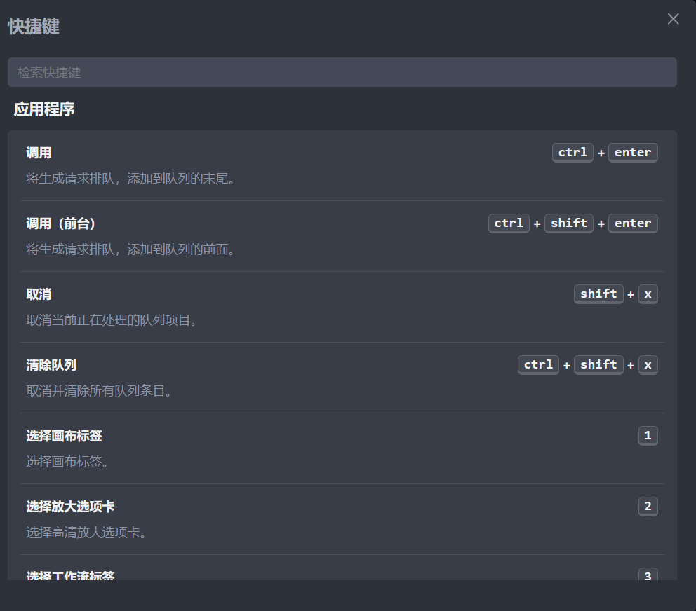 InvokeAI 为了方便操作,支持使用快捷键打开某些功能,在 InvokeAI 左下角的设置选项可以看到快捷键,打开后可以查看 InvokeAI 的快捷键对应的功能。