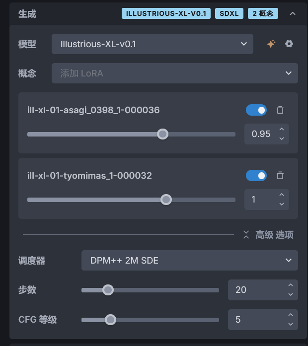 模型设置使用的大模型,这里选择前面下载的 Illustrious-XL-v0.1,概念设置要使用的 LoRA 模型,这里先跳过该选项。